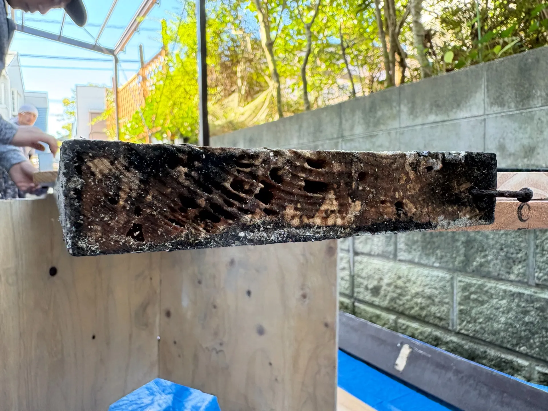 現場で外した木を見たら、シロアリにずいぶん食べられてしまっていました。